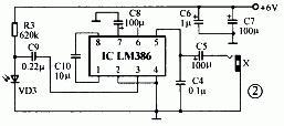 接收部分電路如圖2所示。該電路接收部分采用一塊音頻放大集成電路LM386進行功率放大。VD3為紅外線接收管。