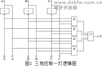 例如,如圖1所示,有一個(gè)T形走廊,在相會處有一盞路燈,在進(jìn)入走廊的A、B、C三地各有一個(gè)控制開關(guān),都能獨(dú)立地進(jìn)行控制。