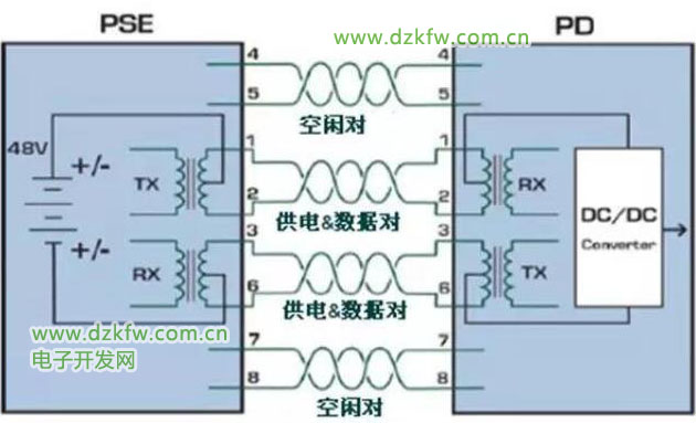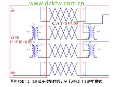 應用數據腳供電時,將DC電源加在傳輸變壓器的重點,在這種方式下線對1、2和線對3、6可以為任意極性。傳輸數據所用的芯線上同時可以傳輸直流電,其輸電采用與以太網數據信號不同的頻率,不影響數據的傳輸。