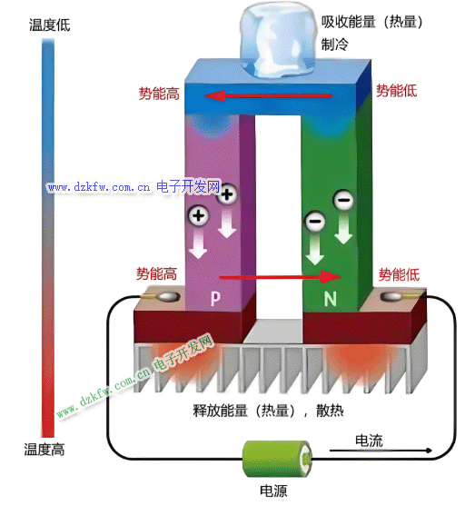 當電流通過一個N型半導體和一個P型半導體組成的特殊半導體材料時,會在接點處產生電子空穴對,導致內能減小和溫度降低,從而在一個端點吸熱并向外界吸熱,形成冷端;而在另一個端點,由于電子空穴對復合,內能增加,溫度升高,并向環境放熱,形成熱端。通過調整電流的方向,可以精確控制哪個端點吸熱,哪個端點放熱,實現制冷效果。